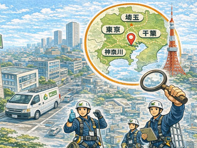 ロープアクセス工法により、足場が設置できない現場や都市部の限られたスペースにも対応可能です。東京・埼玉・神奈川・千葉を中心とした首都圏エリアで、多数のご依頼をいただいています。
